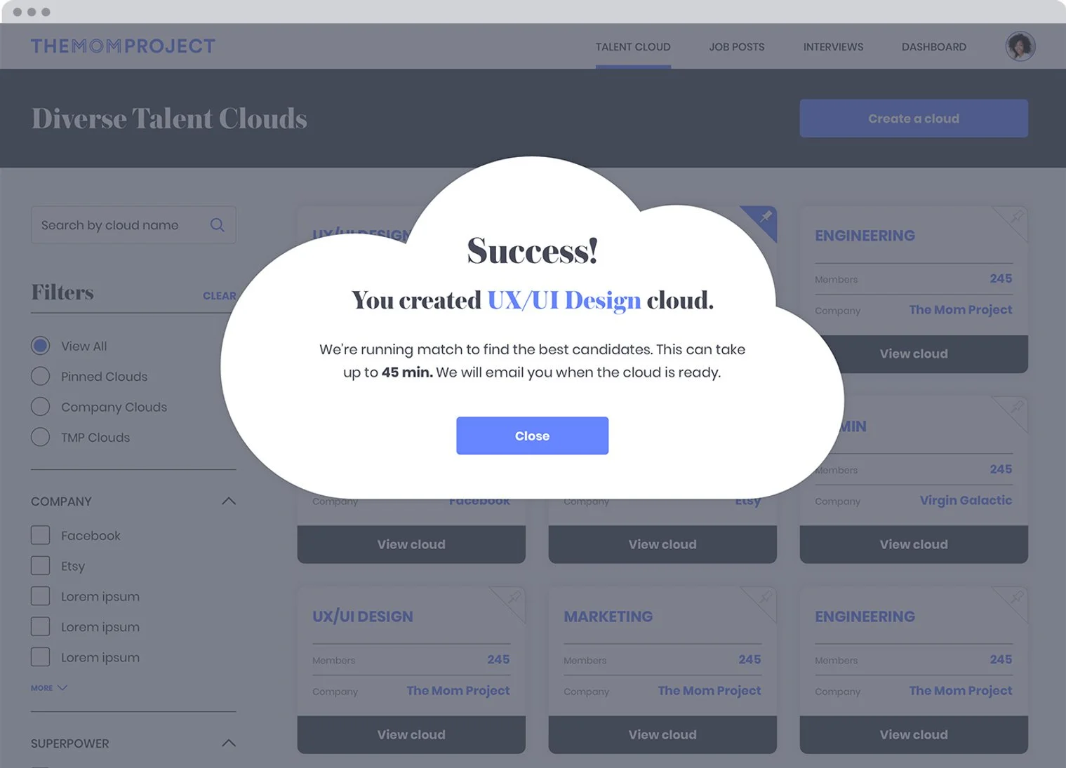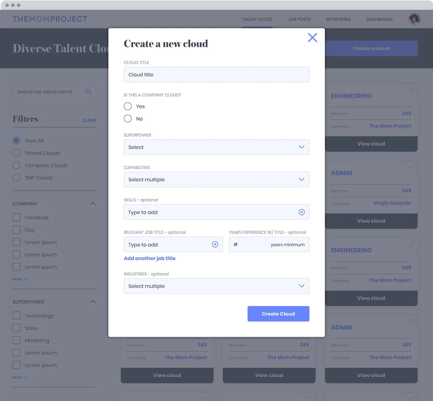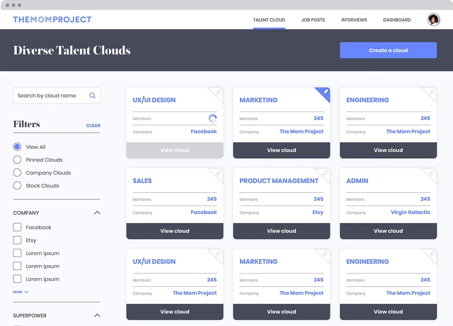 Users can also search the clouds, filter by company, and filter by superpower (The Mom Project’s coined term for job field.)
