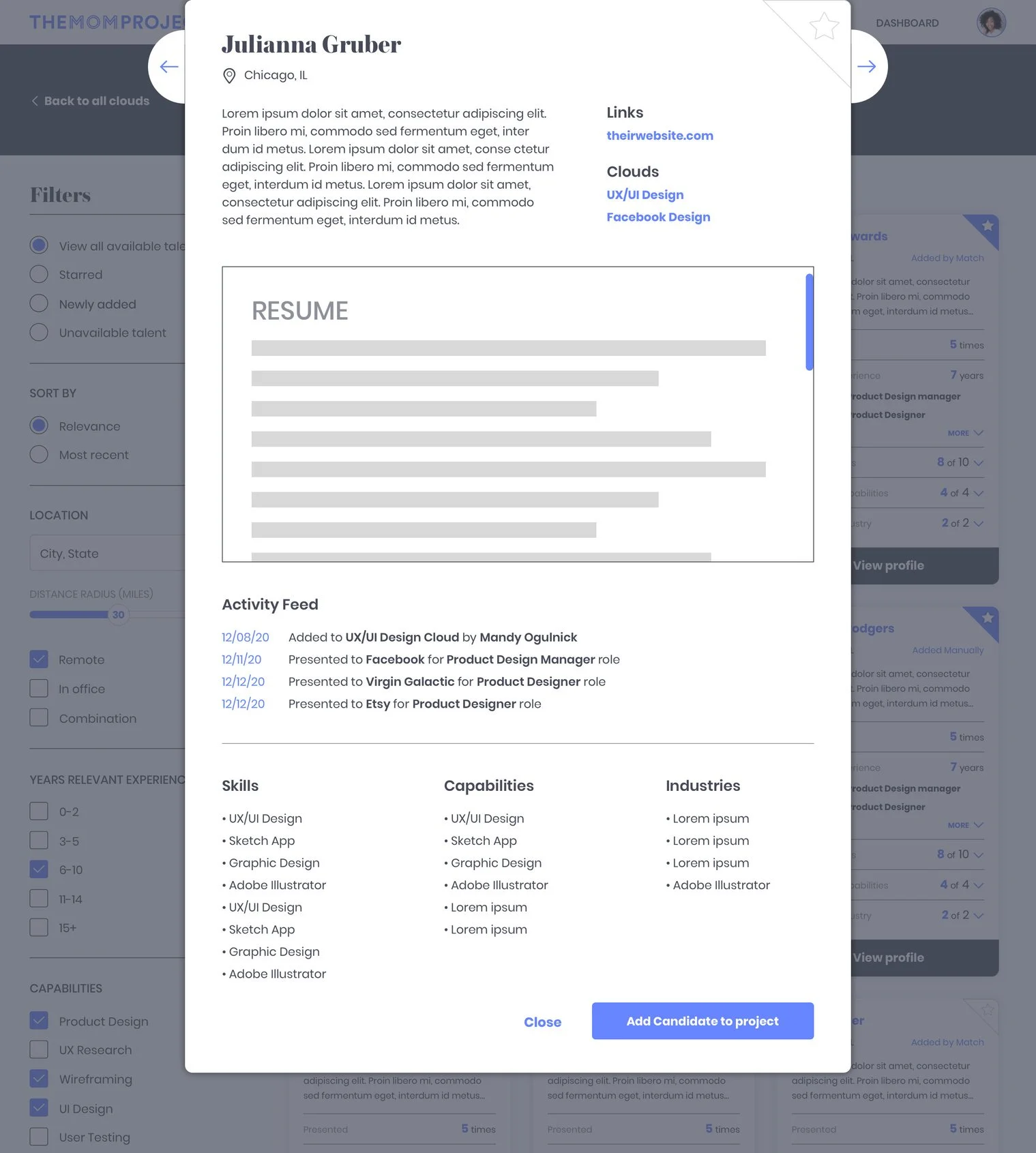 The talent cards provide an overview of the cloud members so it is easy to quickly look through many members at a time. Talent managers are able to see a brief overview of the talent with their matching skills, experience, capabilities, and industries by clicking to expand the cards. If they want a more detailed view of the candidate, they can click through to their profile.