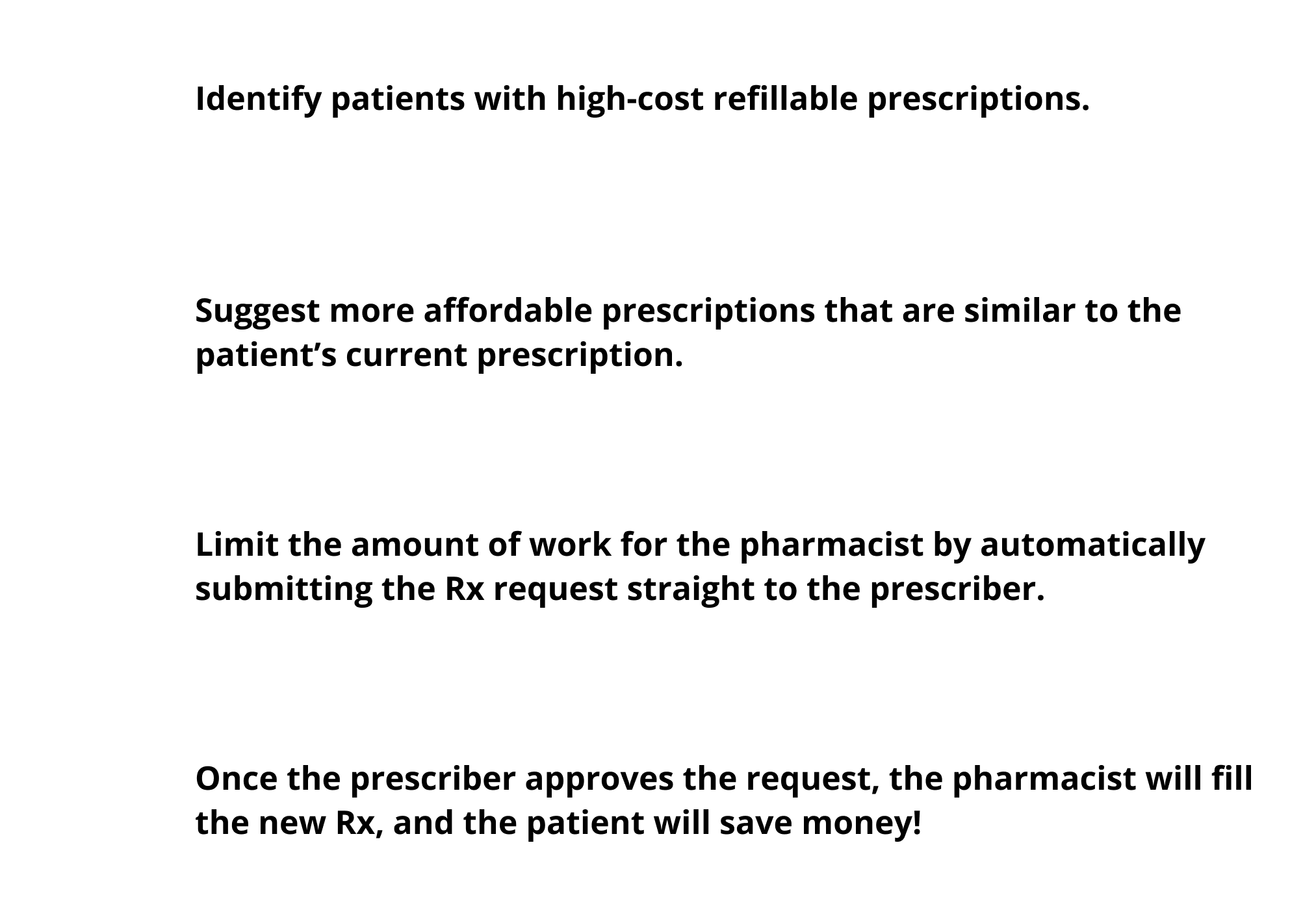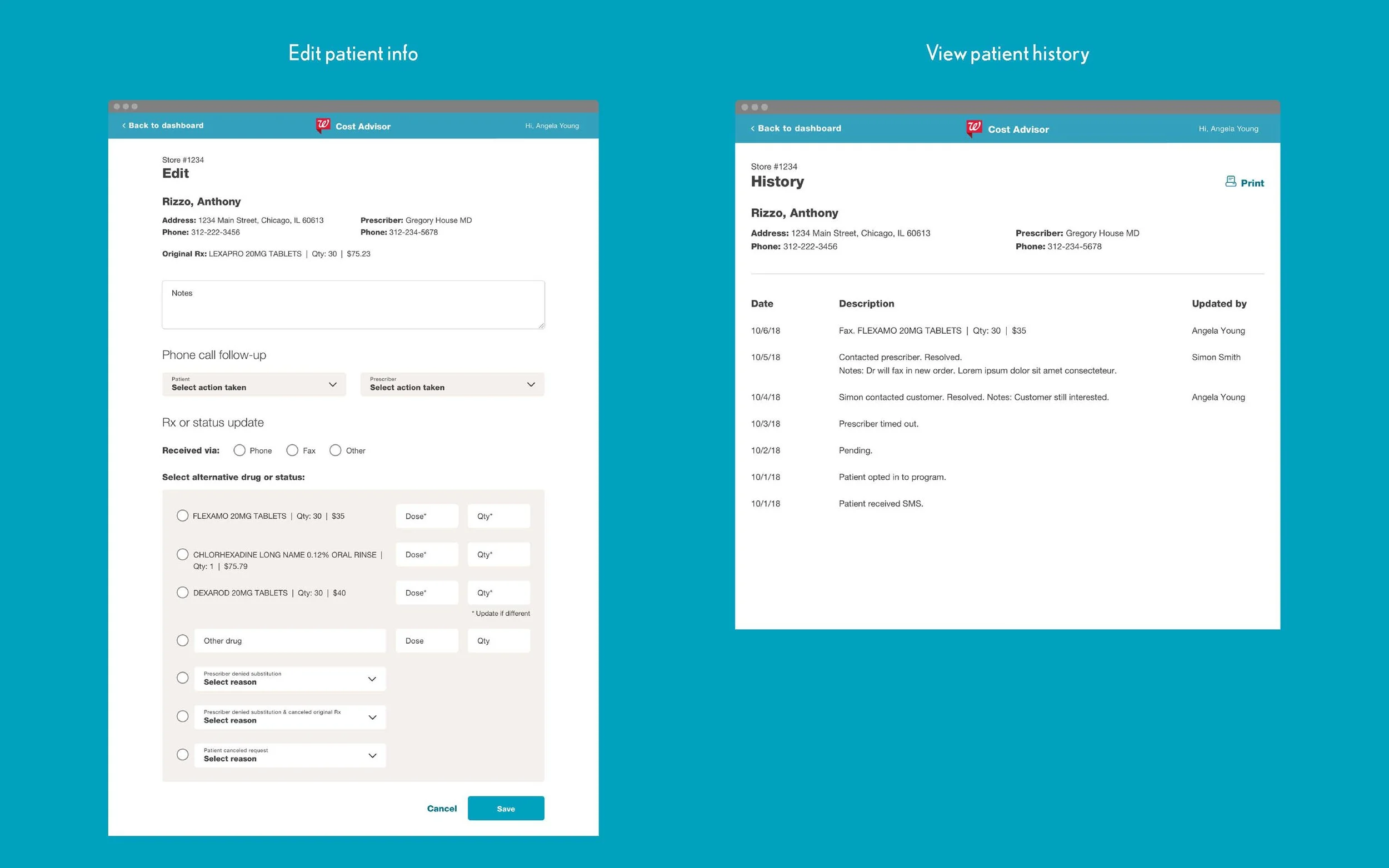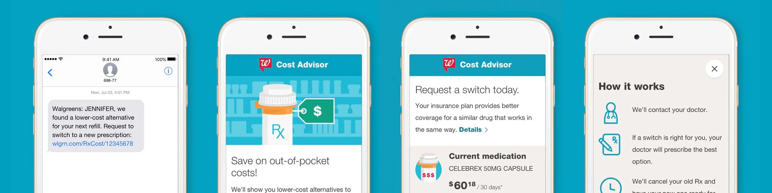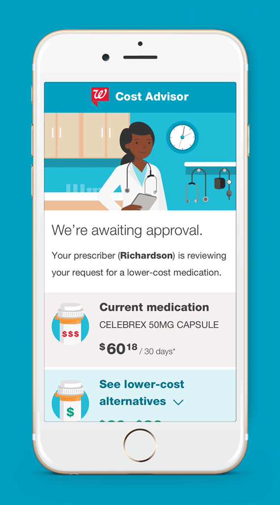 Walgreens Rx Cost Advisor is a program that helps patients find a lower-cost alternative to their current medication. This project was part of Walgreen's broader effort to be more transparent about medication costs. The patient will receive a text message informing them of the program, and within the flow, they are shown more affordable medications that are similar to their current drug. If the patient requests to switch, a request is sent to their doctor, and their doctor will choose the best option for them. The doctor's response is sent to the pharmacy, and the prescription status is managed within a pharmacy portal created for this program.